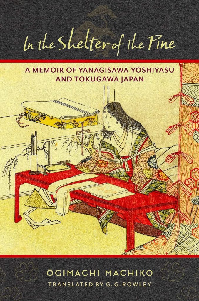 The cover of In the Shelter of the Pine is a woodblock print in the collection of the Metropolitan Museum of Art showing an idealized court lady kneeling at her desk with a selection of shikishi (square cards) and tanzaku (rectangular strips) for writing poetry in front of her. A brush holder and inkstone are to her right, but she has not begun grinding the ink yet and her hands are hidden in the sleeves of her kimono. The print is by the ukiyoe artist and haikai poet Kubo Shunman 窪俊満 (1757-1820) and is dated to Kansei 寛政 7/1795.